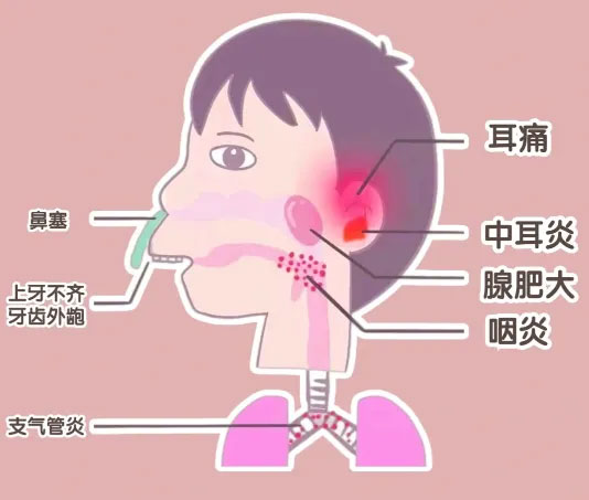 2、呼吸道疾?。合贅芋w肥大、扁桃體肥大等可能導(dǎo)致孩子睡覺(jué)打呼嚕、張口呼吸等癥狀,長(zhǎng)期下去可能引發(fā)呼吸道疾病,影響孩子身體健康。